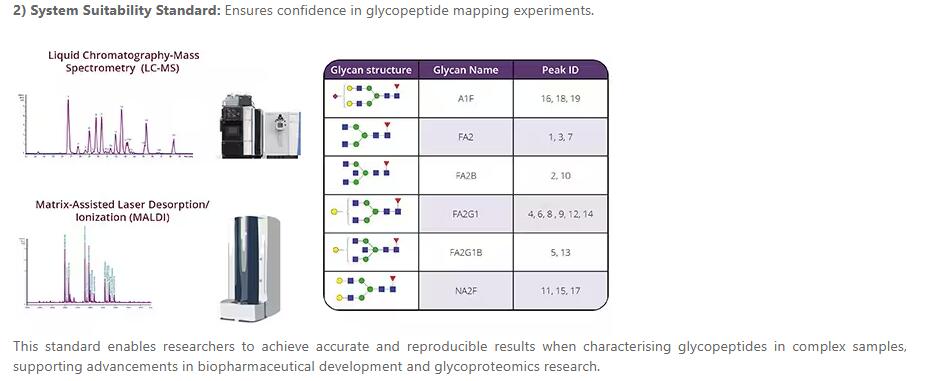 这种高质量标准源自于从人血清中提纯的免疫球蛋白 G 糖蛋白。糖肽经胰蛋白酶消化并富集,以提供具有代表性的糖型混合物,包括具有唾液酸化、半乳糖化、N-乙酰葡糖胺化和岩藻糖基化的双天线寡糖。