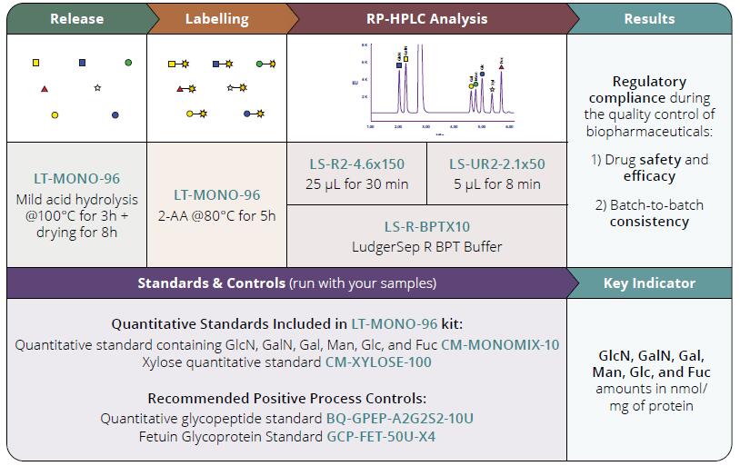 单糖分析是《ICH Q6B 指南》中规定的用于表征生物制药产品的监管要求。此信息可在药物开发的各个阶段使用,作为确定糖基化类型(N-连接和/或O-连接)以及糖基化发生程度的方法。此外,它还可用于在生产过程中证明不同批次之间的一致性,以用于质量控制批次放行。